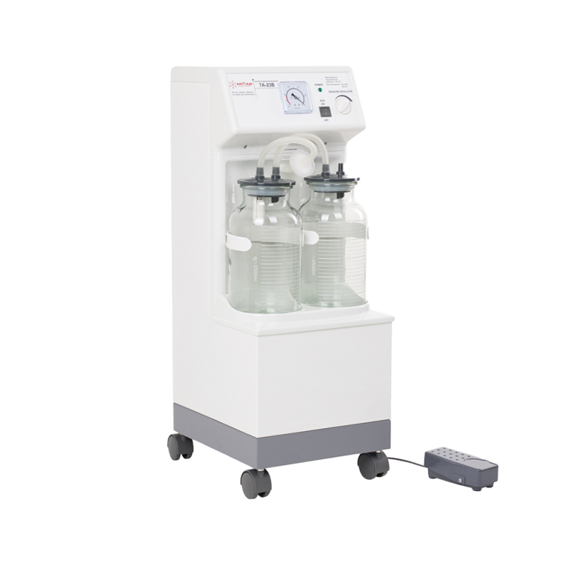 Аспиратор имеет простую и понятную панель управления, на которой расположено всего 2 кнопки: кнопка запуска/выключения и регулятор давления.На крышке одной из двух стеклянных емкостей-сборников предусмотрено специальное защитное поплавковое устройство. Это защитит от перелива собранной жидкости.Отсасыватель оснащен маленькими маневренными колесиками, обеспечивающими удобное перемещение устройства.Отсасыватель 7A-23B может непрерывно работать в течение 240 минут, поэтому подходит для проведения длительных хирургических операций.Для запуска отсасывателя Армед 7А-23В можно использовать ножную педаль, которая входит в комплектацию.Устройство дополнено специальным металлическим наконечником, который используется при полостных операциях.