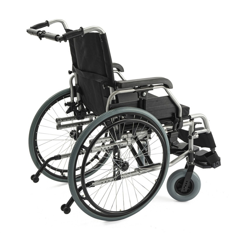 • Адаптивность под пользователя: ширина сиденья 46 см, глубина — 42-50 см, а съемные подлокотники с регулировкой по высоте позволяют идеально подогнать коляску под анатомические особенности и потребности пользователя.