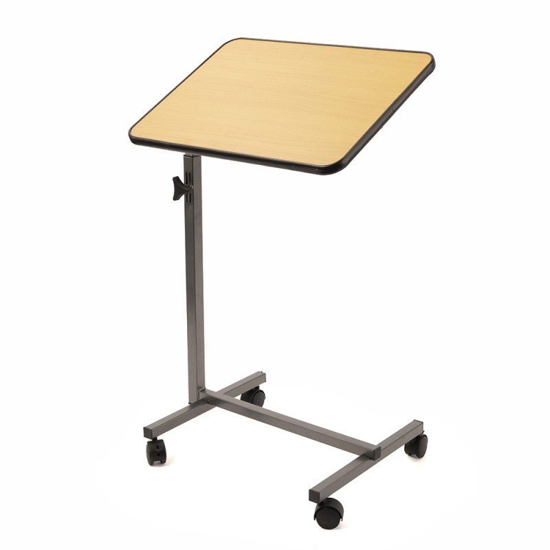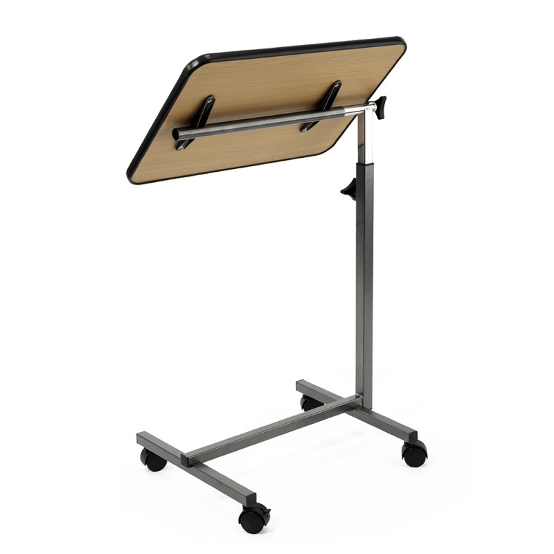 Благодаря регулировке по высоте и углу наклона столешницы, столик легко адаптируется под индивидуальные потребности пользователя. Поверхность выполнена из ламинированного ДСП и выглядит аккуратно, проста в уходе и прослужит долго. Пластиковый бортик по краю не даст предметам соскальзывать со стола. Мобильность обеспечивают 4 колеса, два из которых фиксируются тормозами для устойчивого положения.
