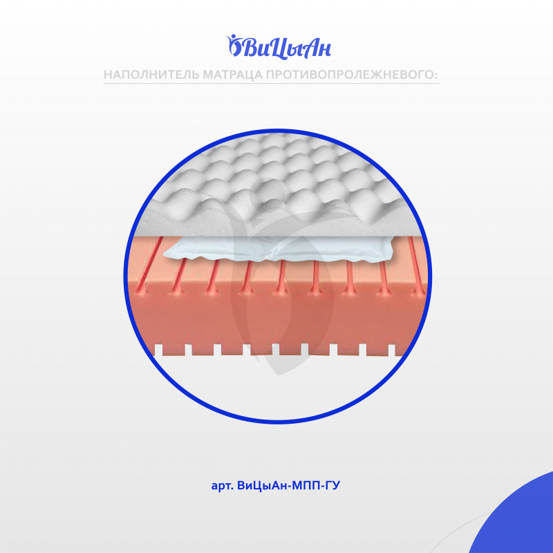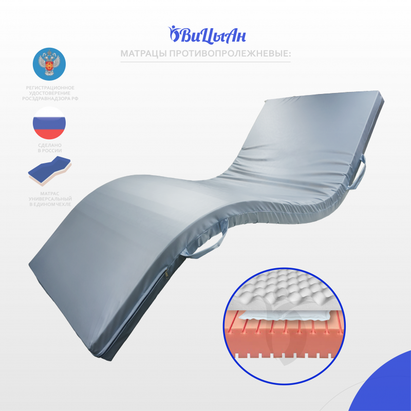 Матрац изготовлен из эластичного пенополиуретана со специальным трапециевидным профилем, с эффектом "воздушной подушки", гелевым наполнителем и натуральным латексом, это сочетание эффективно распределяет давление тела пациента на поверхности ложа.Матрац предназначен для людей с нарушением функций опорно-двигательного аппарата и нервной системы в целях предотвращения пролежней. Профилактика пролежней при длительном лежании. Обеспечение максимального комфорта. Комплексная реабилитация лечения пролежней. Для комфортного сна. Имеет направление положения.Матрац изготовлен из эластичного пенополиуретана со специальным трапециевидным профилем, с эффектом "воздушной подушки", гелевым наполнителем и натуральным латексом, это сочетание эффективно распределяет давление тела пациента на поверхности ложа.Матрац предназначен для людей с нарушением функций опорно-двигательного аппарата и нервной системы в целях предотвращения пролежней. Профилактика пролежней при длительном лежании. Обеспечение максимального комфорта. Комплексная реабилитация лечения пролежней. Для комфортного сна. Имеет направление положения. Уникальная конструкция матраца имеет в основании трапецевидный профиль, который формирует независимые конусы, эффективно распределяющие давление тела на поверхности ложа кровати. Поперечный профиль на нижней стороне матраца, позволяет ему принимать форму ложа, 1-2-3-4-секционной кровати. В зонах повышенного риска образования пролежней расположены ниши со вставками из 6-ти упруго-перетекающих гелевых элементов по 4-ре независимых кам.