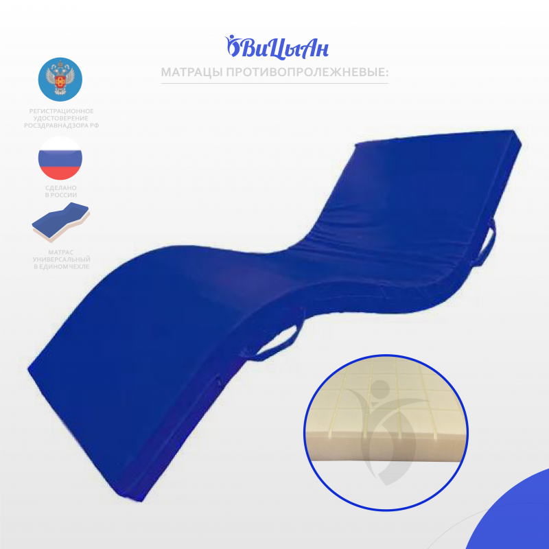 Показания к применению – равномерное распределения давления на тело пациента, с целью профилактики образования пролежней у больных с нарушением опорно-двигательного аппарата, для снятия нагрузки на позвоночник.Противопоказания - вытяжение шейные и скелетные, травмы позвоночника и спинного мозга, при наличии открытых пролежней и по остальным противопоказаниям необходимо проконсультироваться с лечащим врачом.Побочные действия не выявлены.Уникальный фигурный профиль, эффективно распределяют давление тела на поверхности ложа кровати. Влагонепроницаемый съемный чехол матраца изготовлен из мембранной, синтетической ткани (полиэстер 100%) с влагонепроницаемым, паропроницаемым, полиуретановым покрытием плотностью 210 г/м² . На чехле по центру торцевой части вшита молния.1. Благодаря уникальной конструкции матрац оказывает хорошую поддержку тела во время сна и создает все условия для полноценного лечения.2. Ячейки наполнителя не слипаются, независимые конусы даже при максимальой нагрузке на них оставляют между собой воздушные каналы, создавая вентиляцию, что значительно увеличивает срок эксплуатации.3. Съемный чехол легко снимается, поэтому осуществлять надлежащий уход и своевременную обработку, дезинфекцию, стирку и сушку (в зависимости от загрязнения) матраса можно многократно. 4. Не имеет швов на рабочей поверхности5. Молния защищена влагонепроницаемым клапаном6. Благодаря водонепроницаемому покрытию, жидкость с поверхности чехла легко удаляется и не проникает во внутрь изделия.7. Специальная антибактериальная обработка, защищает от распространения бактерий.8. Эластичность чехла позволяет не вызывает ответного давления и способствует равномерному распределению массы тела на поверхности ложа.9. Антискользящая поверхность препятствует скатыванию