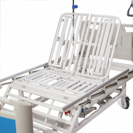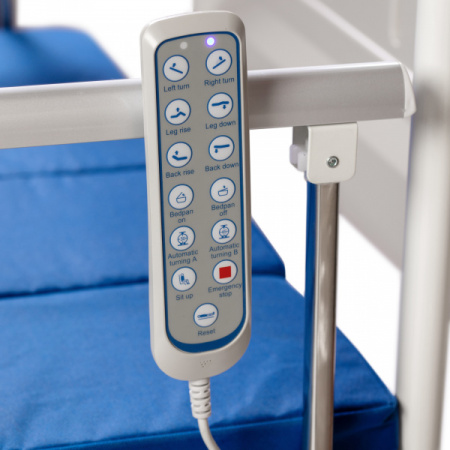 - Секции для превращения кровати в кресло, переворачивания пациента на бок и пользования туалетом приводятся в движение путём нажатия соответствующих кнопок на пульте дистанционного управления.