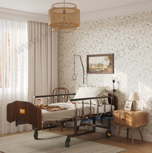 Медицинская кровать с функцией переворачивания, спинками из ЛДСП приятной "деревянной" текстуры, объединяющая в себе функции кардио-кресла и переворачивания больного с санитарным оснащением.