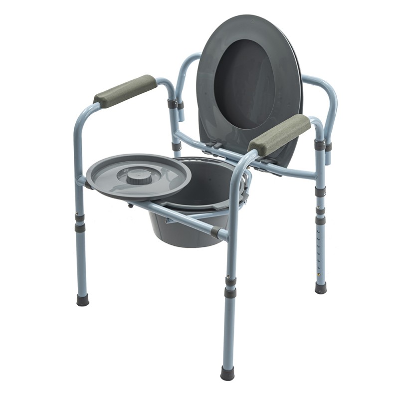 Кресло-туалет 10590 обладает складной конструкцией из стали. За счет особенно компактной схемы складывания модель обладает очень малогабаритной индивидуальной упаковкой. Съемное ведро, крышка, защита от брызг и подлокотники выполнены из практичного гигиенического пластика.