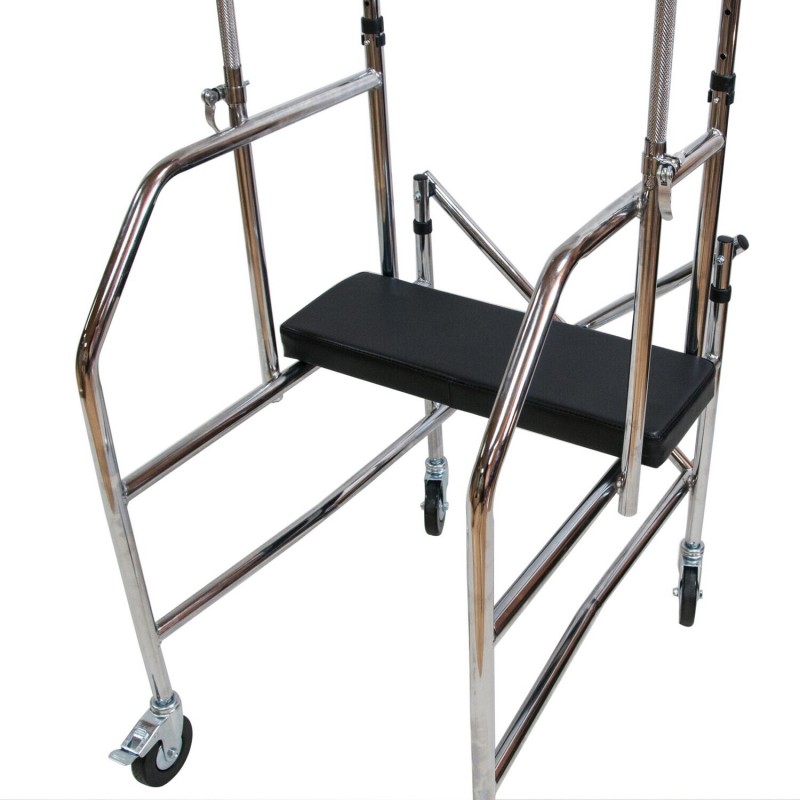 Ходунки и подмышечные стойки выполнены из хромированной стали и не подвергается коррозии, съемное сиденье выполнено из искусственной кожи. Четыре колеса конструкции обеспечивают легкость передвижения без лишних усилий. Задние колеса оснащены стояночными тормозами.